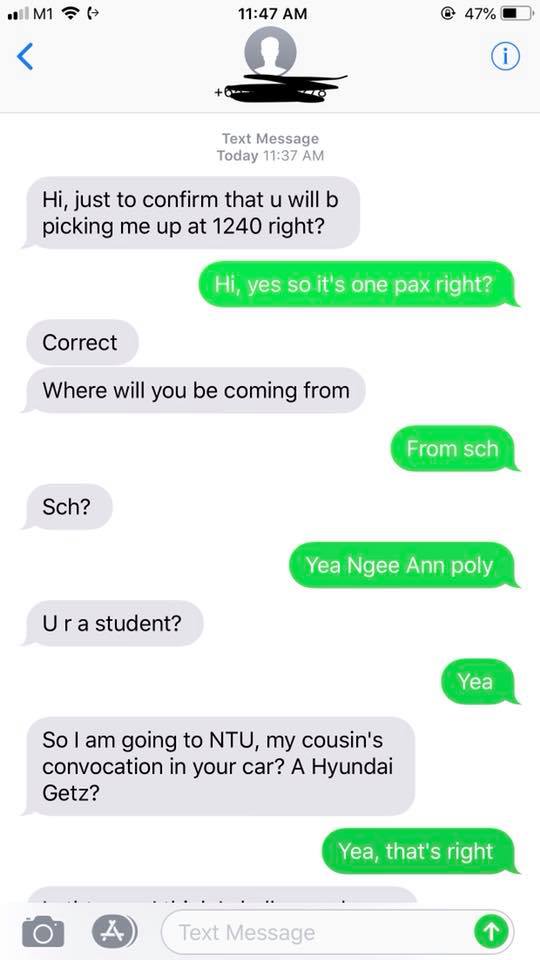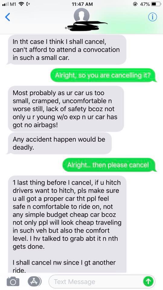 Joel Soon, however, didn’t even get to pick up his passenger — and probably for the better too. After school on Monday, he accepted a hitch request from a person who needed to get to Nanyang Technological University to attend his/her cousin’s convocation. Not only did the passenger complained that Soon’s car is “too small, cramped, uncomfortable”, but the student was also accused of not having driving experience.