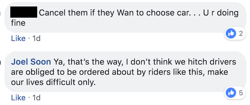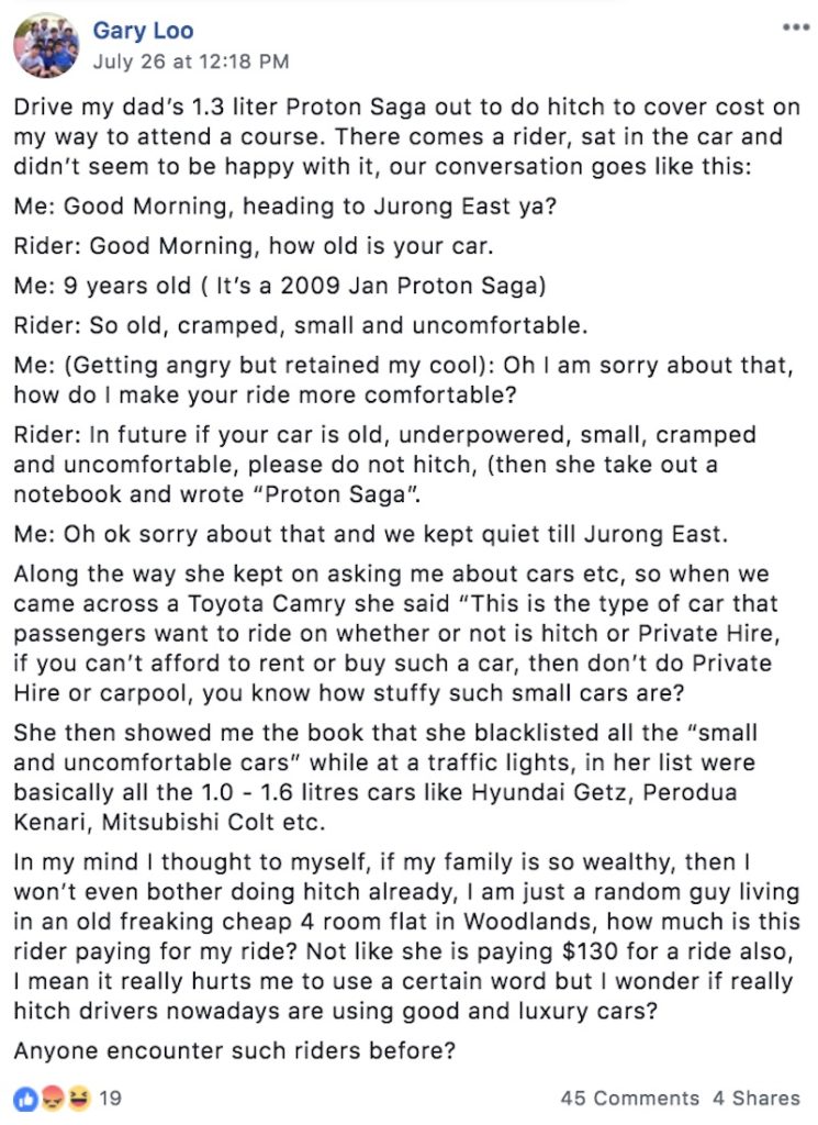 This incident sounds way too similar to a picky passenger encountered by another GrabHitch driver and a Rydepool driver. As Mothership reported, a woman had a particular vendetta against “small” and “old” cars. Like Soon’s experience, the two other drivers also faced unfair rebukes over the quality of their vehicles.