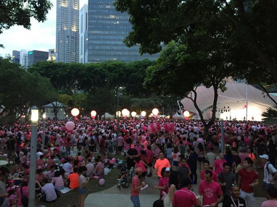 Most participants came in pink to the rally in Hong Lim Park — Singapore’s only designated protest zone — where expatriates mingled with locals in a field festooned with pink balloons.