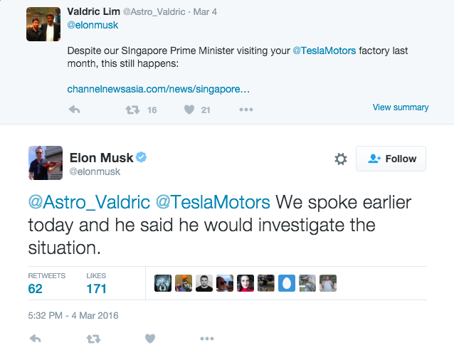 Ironically enough, in many other countries Tesla owners qualify for significant tax breaks for driving their sleek, environmentally-friendly cars. In response to a query by Valdric Lim on Twitter, Musk assured that PM Lee is investigating the case.