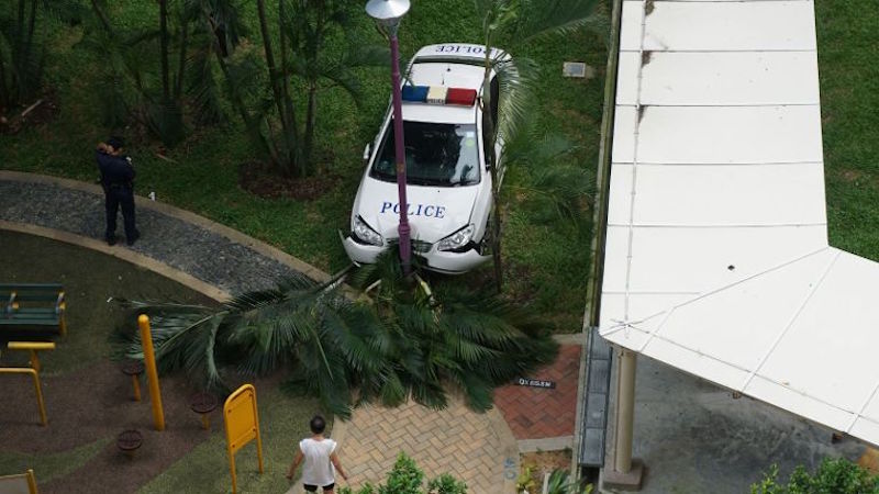 Channel NewsAsia reports that the accident occured on Monday (the first day of the Chinese New Year), with the police car ending up on a grass patch, mowed down a tree and kissed a lamp post.