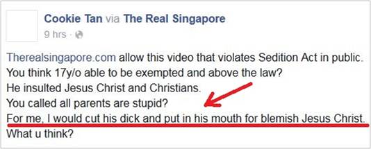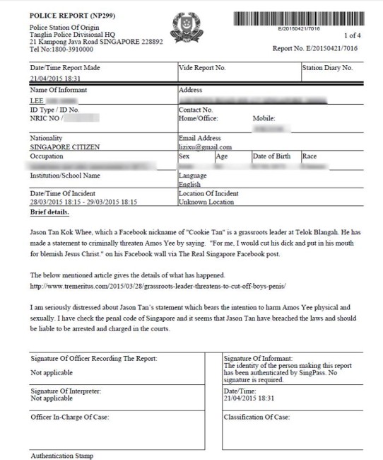 After many weeks of simmering in notoriety, the man who infamously declared his intention to cut Amos Yee’s dick off and stuff it into the boy’s mouth for his remarks against Christianity has been reported to the police.