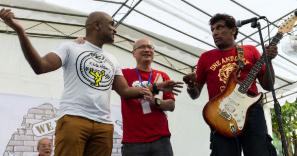 Photo: Gilbert Goh (centre) on stage with performers at one of last year’s Population White Paper protests