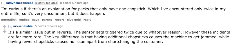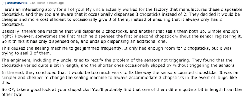 In a thread started by someone who received three disposable bamboo chopsticks in one pack, Redditor u/arksenewbie offered an explanation for the trivial bother — all thanks to an uncle who once worked at a factory that manufactures them. The reason why some plastic bundles get three sticks instead of two is due to bugs in the sensor, and the fact that it’s just simpler to let sealing machines store an extra piece.
