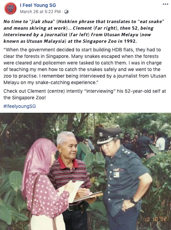 Clement Tan, a retired policeman who first joined the force in 1959 when he was 19, misses the time when he was in his prime. Having rosed through the ranks to become a police inspector before joining the volunteer police force as deputy superintendent, Tan has a lot of fascinating stories to tell about Singapore in the old days. Where he went, he didn’t need a Delorean — active aging movement I Feel Young SG simply utilized the powers of photoshop.
