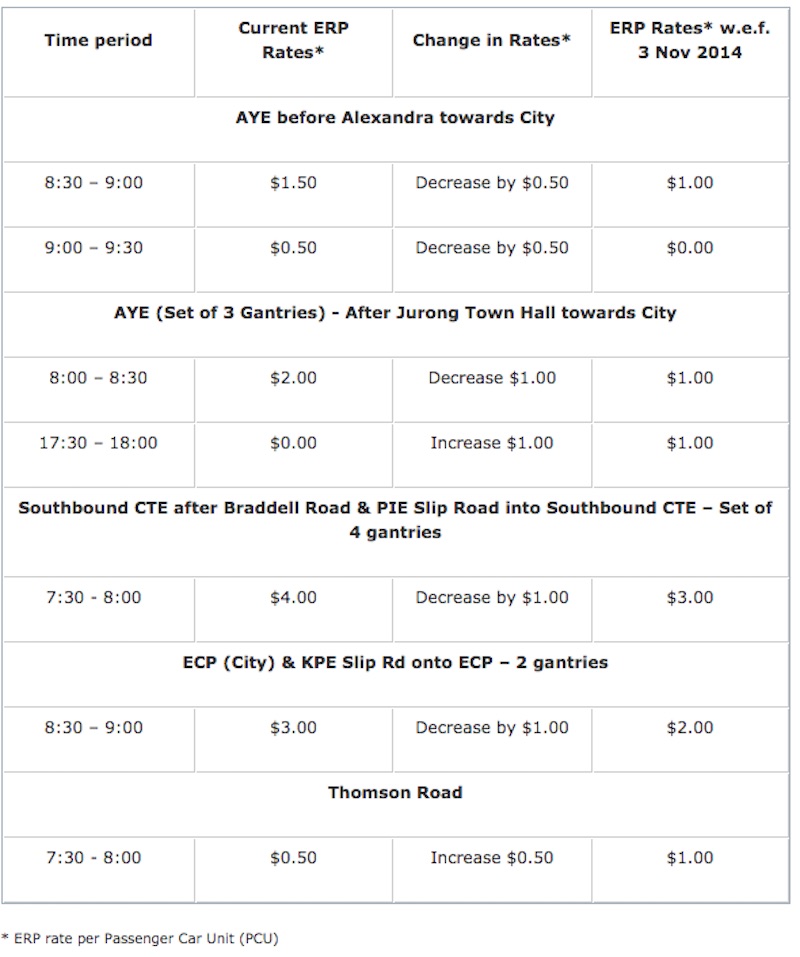 After completeing their quarterly review of traffic conditions, the Land Transport Authority has announced revisions in the Electronic Road Pricing (ERP) rates in selected roads and expressways that will kick off in Nov. 3.