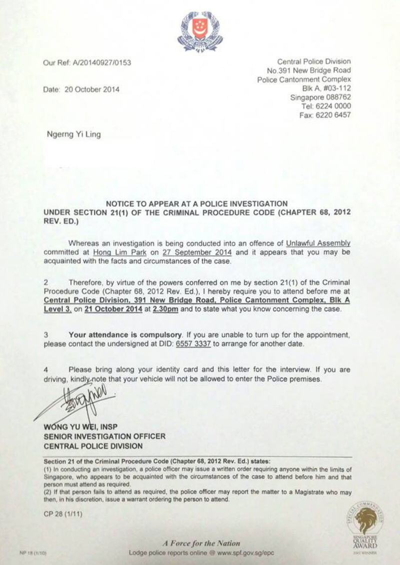 Yesterday, a short while after announcing his return from Malaysia where he was said to have met up with like-minded activists, Ngerng uploaded the letter from the police summoning him to the police complex at New Bridge Road at 2:30pm today, to investigate an offence of “Unlawful Assembly”.