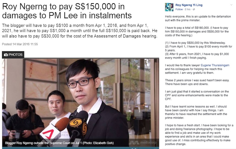 This morning, news broke about blogger Roy Ngerng’s payment terms to PM Lee. To recap, he has to pay $150,000 over the course of 17 years, starting with $100 a month for five years. And that’s on top of the $30,000 he must fork out by this Wednesday to cover the cost of the Assessment of Damages hearing.