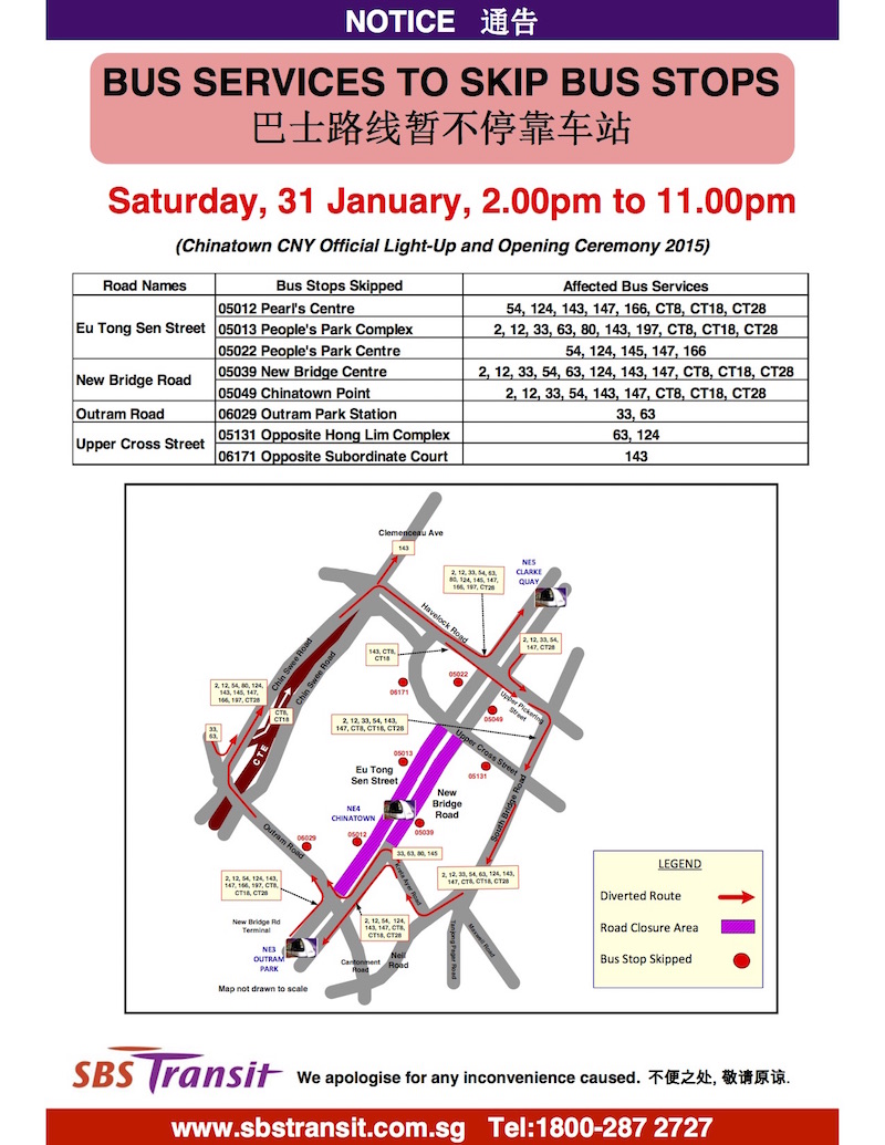 On Jan 31, SBS Transit bus services in the Chinatown area will be diverted due to road closures, while operating hours of train services will be extended that evening.