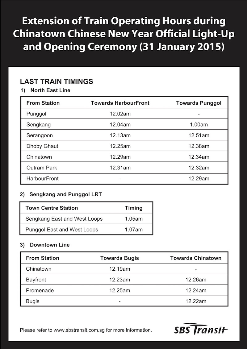 To facilitate the Chinese New Year festivities, SBS transit has announced that their bus and train services will be extended, while some buses operating along the Chinatown district will be diverted due to the Official Light-Up and Opening Ceremony.