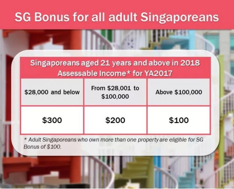 This bonus will be based on assessable income. Those with an assessable income of $28,000 and below will receive $300; those with an assessable income of between $28,001 to $100,000 will receive $200, with the remaining higher income group of above $100,000 receiving $100. This one-off SG Bonus is on top of the usual GST and U-Save vouchers.