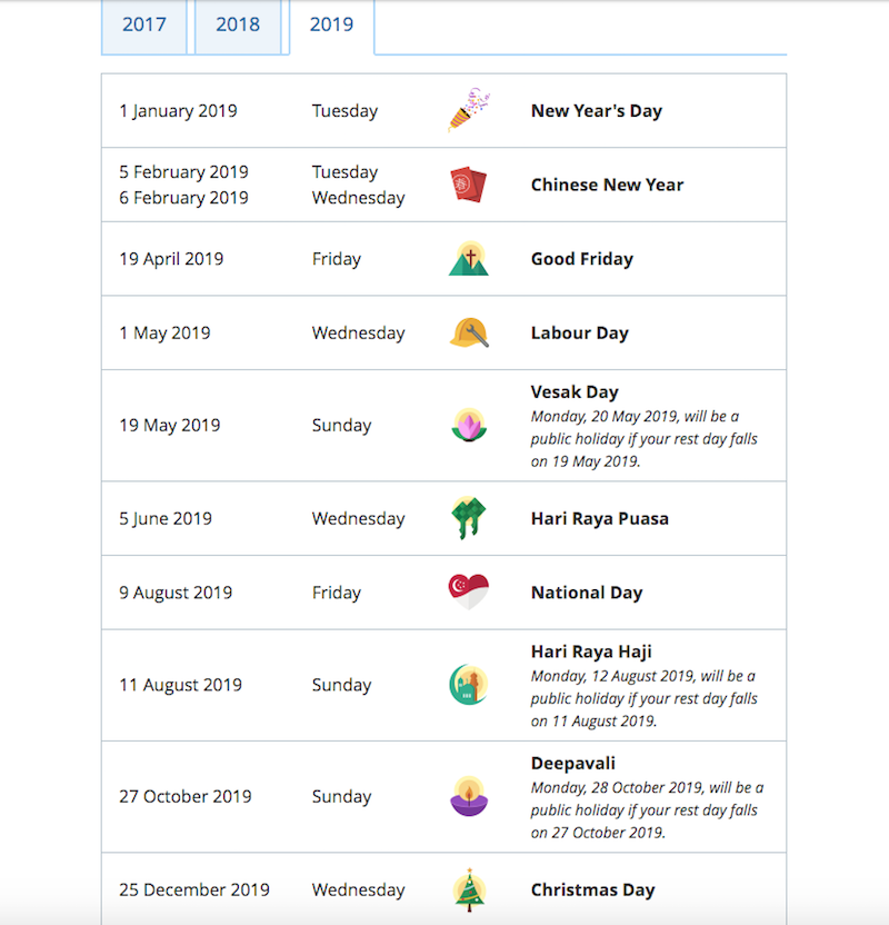 Released by the Ministry of Manpower today, the list of 11 public holidays in Singapore for 2019 include Good Friday (Apr. 19) and National Day (Aug. 9) falling on Fridays, and Vesak Day (May 19), Hari Raya Haji (Aug. 11), and Deepavali (Oct. 27) falling on Sundays, which means off days for all on the following Mondays.
