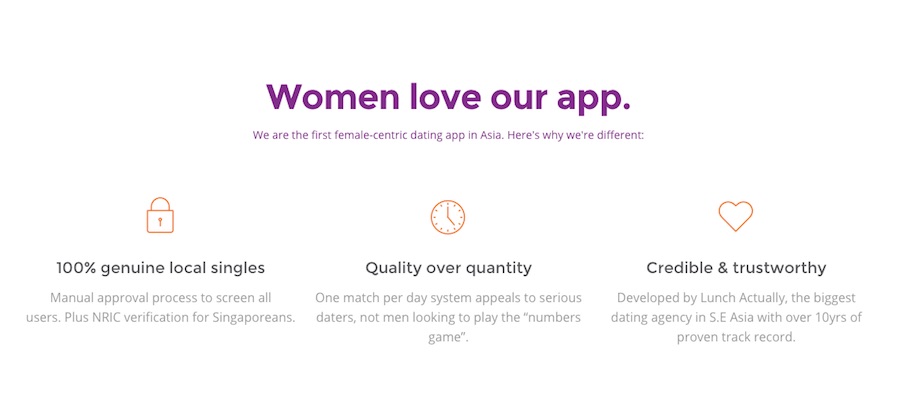 LunchClick, Violet says, is the first app that will do manual NRIC checks with Singapore’s Registry of Marriages (ROM) and the Social Development Network. If you’re wondering, the approval process takes only a few hours — that’s a small price to pay to prevent nasty surprises further on.