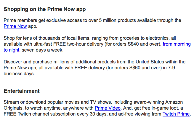 As part of its promotional effort, membership fees for Singaporeans are offered at the sweet, sweet price of S$2.99 a month for a limited time before they revert to the standard S$8.99 monthly. For that amount, members get to enjoy Prime Video, a membership with video game streaming platform Twitch, and unlimited free international shipping on orders above S$60 on the Prime Now mobile app.