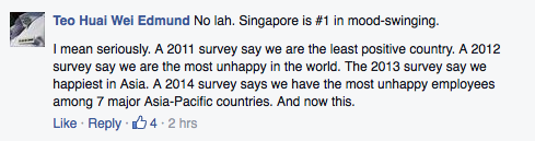 Singapore clinched the 22nd position, making us the happiest country in the Asia-Pacific region. Thailand was next, at 33rd place, with Taiwan at 35th and Malaysia at 47th.