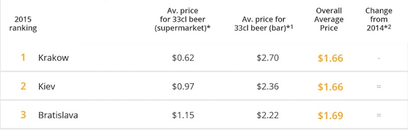 If you do want to get hammered for cheap, the Beer Price Index suggests that you head down to Eastern Europe, whose average price of beer count among the lowest in the world at less than USD1.70 in the cities of Krakow, Kiev and Bratislava.