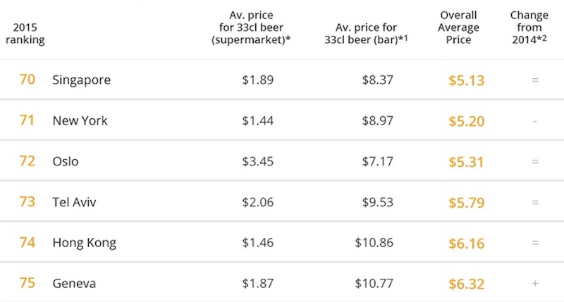 On the world stage however, Singapore ranks in sixth place as the costliest place to have a beer, well behind the cities of Tel Aviv, Oslo and New York.