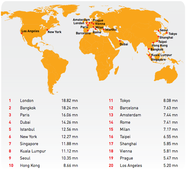 The honor of top destination city in the world goes to London with 18.82 million international visitors, while runners-up Bangkok gets 18.24 million, according to MasterCard. “Given the very thin margin that London has over Bangkok, about half a million international visitors, their rivalry for the top rank is likely to persist,” they wrote.