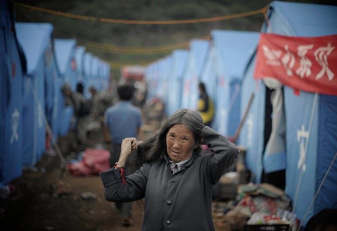 Photo: A woman combing her hair at a temporary shelter in Longoutshan township of Ludian country in Zhaotong, southwest China’s Yunnan province. The death toll from an earthquake that devastated a remote region of China jumped to nearly 600 people Aug. 6, authorities said, as volunteer rescuers were warned away; AFP / China Out