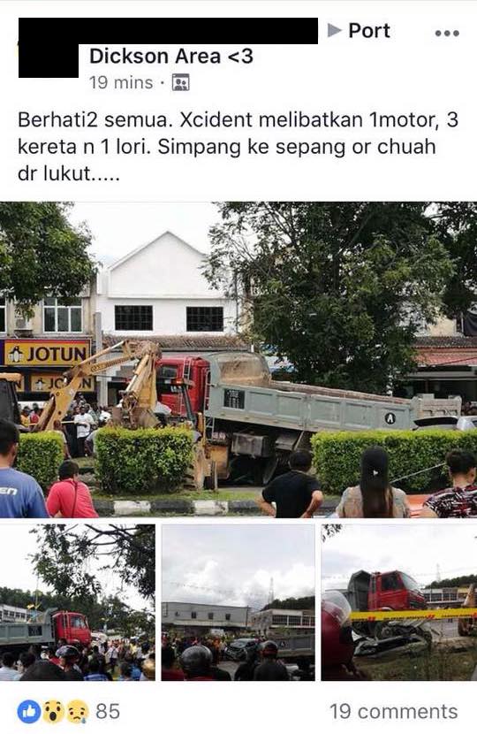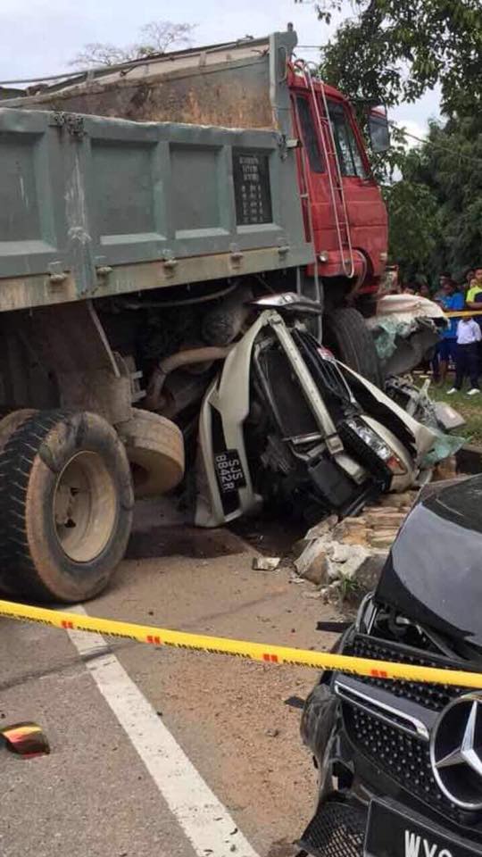 According to internet chatter, the accident that was believed to have involved a motorbike, three cars, and a dump truck transpired at about 3:30pm in Lukut, a small town in Port Dickson. One of the cars in the carnage — the one that seemed to be the most damaged — was Singapore-registered, sporting the license plate SJS8842R.