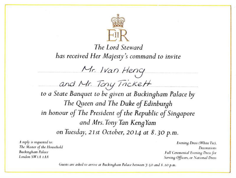 Uploading the invitation on Facebook, which arrived just 12 days after he married long-time partner Tony Trickett in London’s Chelsea Town Hall following the Queen’s Royal Assent to The Marriage (Same Sex Couples) Act in England and Wales, Heng wrote, “My husband and I are very moved and deeply honoured to attend. We do so as proud representatives of Singapore and members of the Singapore arts community.”