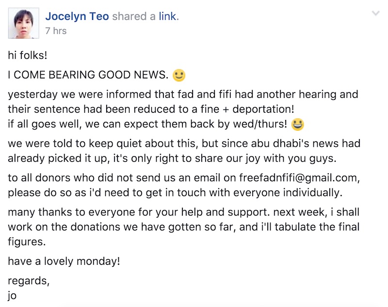 26-year-old Muhammad Fadli Bin Abdul Rahman and 37-year-old Nur Qistina Fitriah Ibrahim had their charged reduced on Sunday by the Abu Dhabi Judicial Department, The National reported. They’ll have to fork out a Dh10,000 (SGD 3,688) fine and be deported back home to Singapore. According to the Facebook group campaigning for their release, the two are expected to be back by this Wednesday or Thursday.