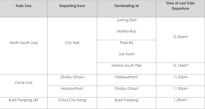 If you’re travelling home on the North-South, East-West and Circle Lines, or the Bukit Panjang LRT, note the departure timings of the last trains at each station.