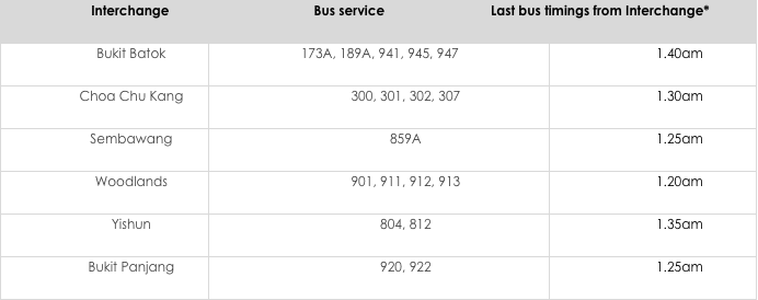 As for bus services, hours will be extended at the Bukit Batok, Choa Chu Kang, Sembawang, Woodlands, Yishun and Bukit Panjang interchanges.