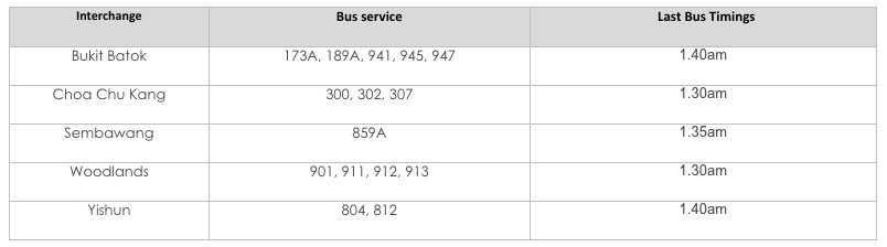 Selected bus services at Bukit Batok, Choa Chu Kang, Sembawang, Woodlands and Yishun will also be extended till after 1am.