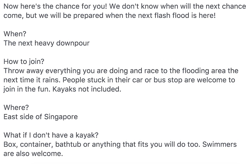 In case you weren’t aware, someone actually did kayak down the flooded streets of Little India back in 2010, so the Facebook event’s not that far-fetched.