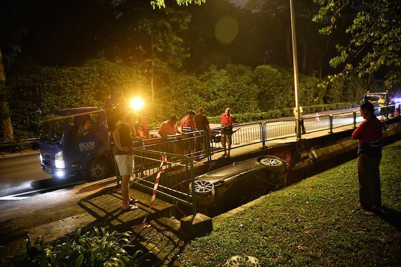 A witness who spoke to The Straits Times noted that a man had been lying down motionless on the grass near the drain — conscious, but “in deep pain and anguish”. Bystanders had to pull a man out from the black sports car that somehow ended up in the ditch.