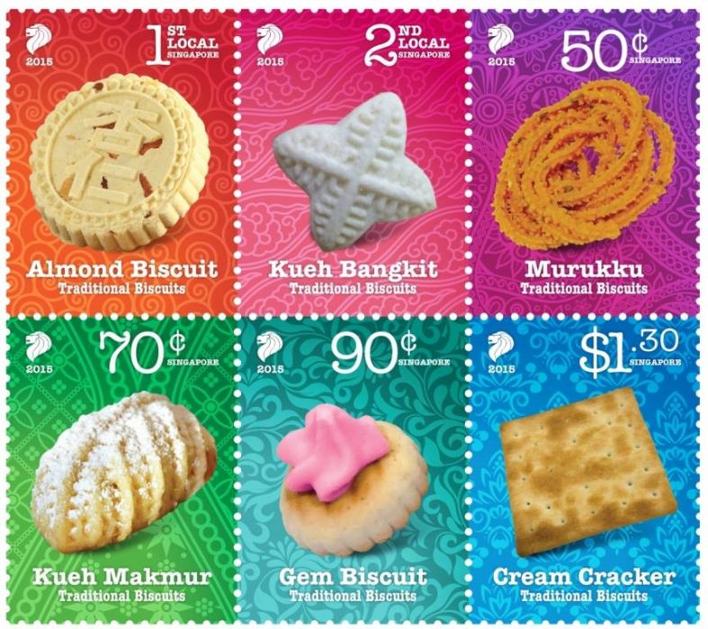 Featured in this colourfully-illustrated set of stamps are traditional Chinese, Malay and Indian delicacies — almond biscuit, kueh bangkit, murukku, kueh makmur — as well as favourite childhood biscuits like gem biscuit and cream cracker that many Singaporeans grew up with in the 1980s.