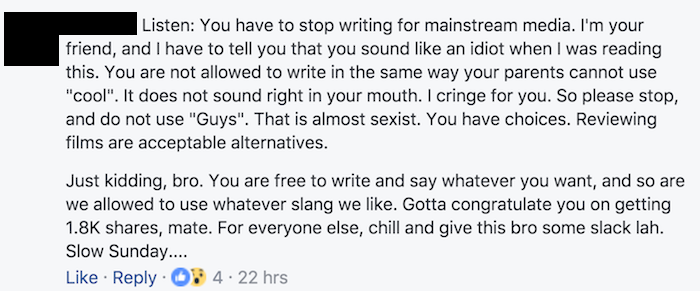 Case in point: This totally unnecessary and uptight overanalysis of guys referring to each other as “bro”, “dude”, and “mate”. TL;DR, this bro John Lui is not a chill dude who likes calling other mates by familiar slangs and terms of brotherhood, and the national newspaper decided that his rant was fit to publish.