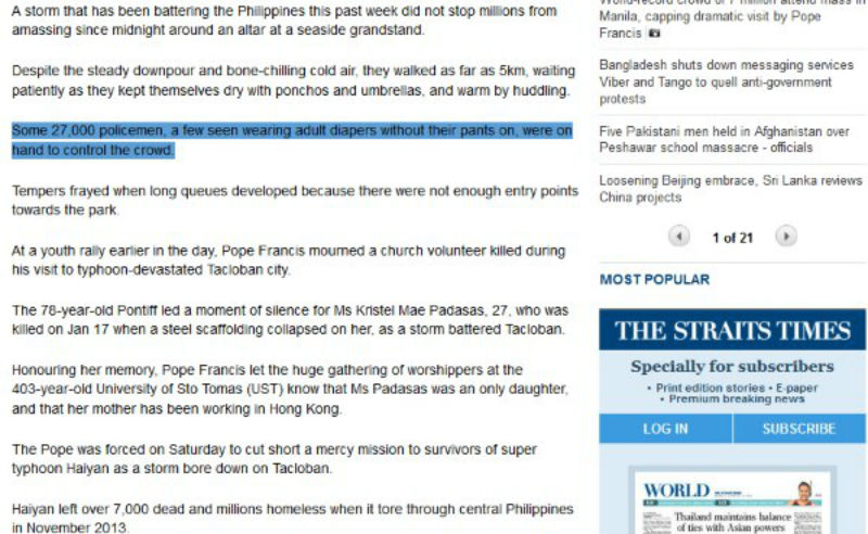 Over the weekend, the Singapore daily ran a report on the Pope’s Manila visit, written by its Philippine correspondent.