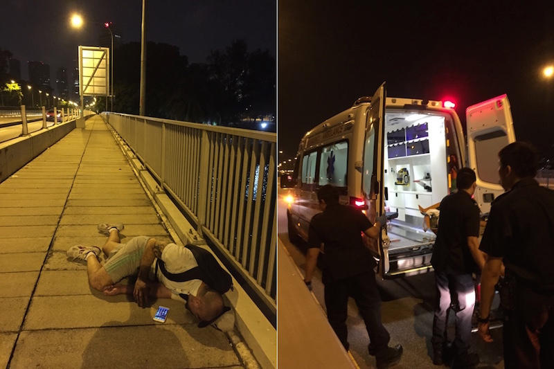 Recounting the incident on his Facebook page, Yinzhou had been walking back home alone from a friend’s engagement party nearby when he spotted the heavyset tattooed man lying by the side of the pavement along Nicoll Highway in the wee hours of the morning today at 2am.