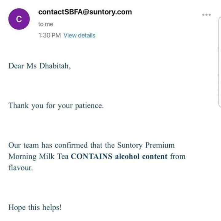 What she claimed to have found out was that Suntory Beverage and Food Asia confirmed the existence of “alcohol content” in the Suntory Premium Morning Milk Tea. And so, she sounded the haram siren on the Instagram account of her Islamic bookshop, Buat Si Manja. The post itself has since been taken down, but the screengrab of an email exchange between her and the company is available elsewhere.
