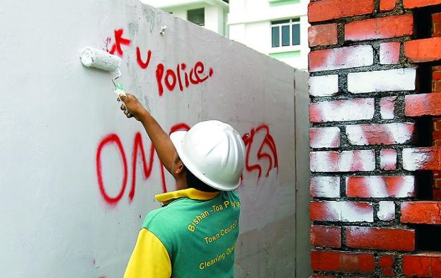 In May last year, Boaz and his mates scrawled curse words addressed to the police. As you can barely see on the photo above, they also put a cross sign on the acronym and logo of the ruling People’s Action Party, reports Channel NewsAsia.