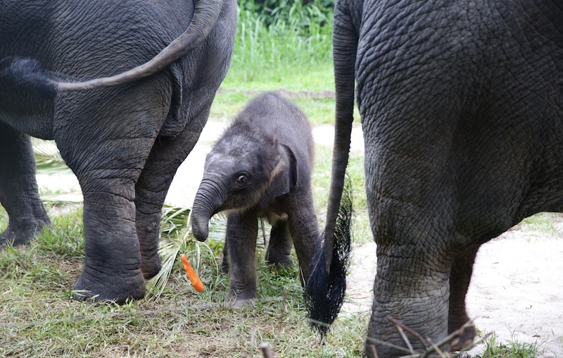 Yesterday marked the public debut of the Night Safari’s first elephant baby in six years. The two-month-old female offspring of 39-year-old Chawang and 30-year-old Sri Nandong was seen happily gallivanting around the Asian elephant exhibit, exploring every nook and cranny in the space.