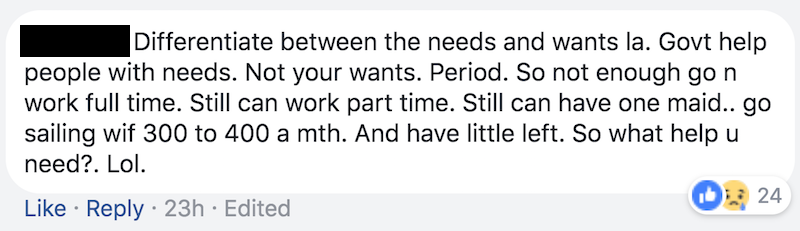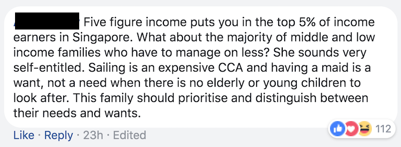 Then you start reading more about her “struggles.” Her daughter is enrolled in sailing as a co-curricular activity (CCA) in secondary school, which costs up to S$400 a year. Then there’s private tuition for her youngest daughter, who’s still in primary school. Surely both of those costs are expendable units — just get one daughter to join an inexpensive CCA and look for a cheaper option to help the other daughter in her education. Plus, having a live-in helper is considered a luxury by most of the developed world.