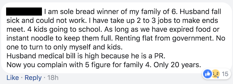 Er, of course her family doesn’t qualify for financial assistance — the monthly income brought home by her husband alone is at least S$10,000 (about US$7,560). With thousands of other families out there who make 10 times less than that each month, this lady’s hoping to get a handout.
