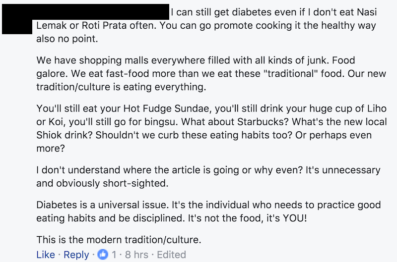 From their perspective, it seems like the traditional methods of Malay and Indian dishes are the only reason why the communities are hit by diabetes. But they ignore other elements such as income levels, costs of living, portion control, education and the existence of unhealthy foods from other cultures.