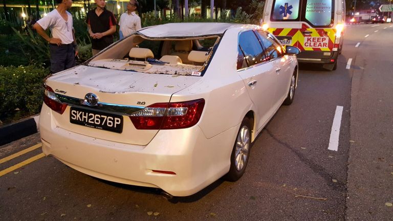 The tree still managed to hit the rear windscreen of the car, which was shattered. When Tan alighted from the car and checked on her 13-year-old daughter, who was in shock, screaming and crying with bits of glass all over her body.
