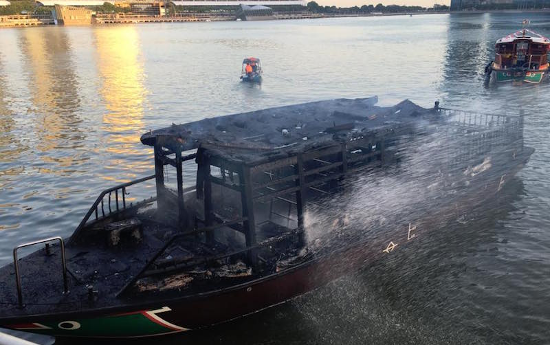 An eyewitness who spoke to Channel NewsAsia yesterday had noted that he saw a person jump off the the river taxi after it caught fire. Other nearby vessels approached the flaming boat, but it’s unclear if they had picked him up from the waters. In this Channel NewsAsia clip, you can see the man leaping from the boat into the river at the 0:48 mark.