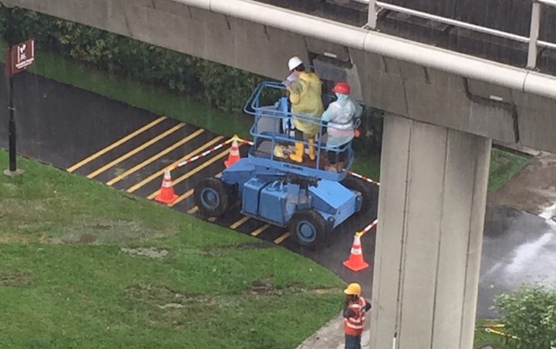 Two optical illusions manifest in this piece of illusionary art spotted and framed by /u/zibin in the Yishun district. Aside from the obvious one involving the construction lift, spot that traffic cone that looks like it’s floating above the construction worker on the ground.
