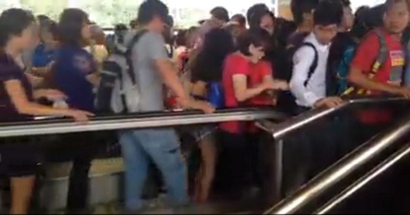 Uploaded by The Real Singapore on their Facebook page, the clip sees commuters helplessly squashed into each other, caught unaware of the overcrowded platform at the top of the escalators. It goes on for way too long before MRT staff finally took action and stopped more commuters from getting on the still-moving escalators — which clearly should have been shut down earlier for the safety of those on the platform.