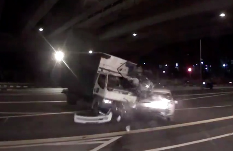 According to footage uploaded on the Singapore Reckless Drivers Facebook page, the accident was a lot gnarlier than it sounded. The impact immediately caused Choon’s car to catch fire while the truck driver was left dangling outside the windshield before the vehicle came to a stop against a trailer. Watch the video below, but we warn you — it’s pretty nasty.