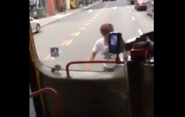 The attacker is almost knocked down by a car when he walks to the roadside, after which the bus drives off.