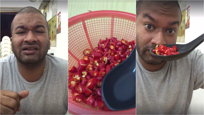 Fuck all y’all, Jerome says while he takes on an even spicier challenge by digging into a whole bowl of chopped chili padi. Also known as the Bird’s eye chili, it scores between 100,000 to 225,000 Scoville heat units on the scale, a heckuva lot worse than the effete Samyang noodles. Note that he eats all that without even breaking a sweat.