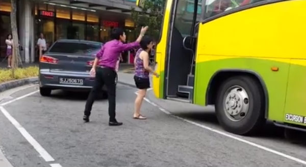 A video apparently shot yesterday, Feb. 12, shows a couple dressed in a matching royal purple (irrelevant, we know, but that was the first thing we noticed) verbally slamming a bus driver in a tiff at what looks to be a mall carpark.