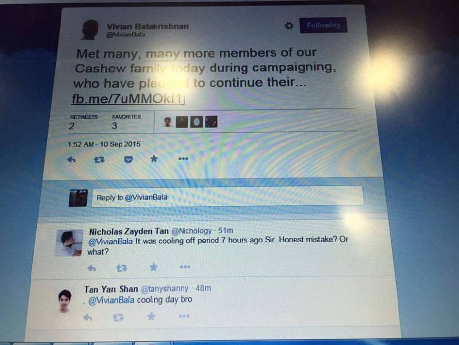 On Cooling-Off Day (that’s today), all candidates are prohibited from engaging in any activities concerning the elections. That means no walkabouts, no advertisements, no meetings, and certainly no posting on social media.